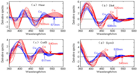 Figure 3 shows the derivative spectral signals of Cu and Co by the continuous wavelet transform with different wavelet functions. Figure 3a shows that when the Haar wavelet is used for the continuous wavelet transform, the derivative spectral signals of Cu and Co have characteristic peaks at 509 nm and 573 nm, respectively. Figure 3b shows that when the Db4 wavelet is used for the continuous wavelet transform, the derivative spectral signals of Cu and Co have characteristic peaks at 525 nm and 508 nm, respectively. Figure 3c shows that when the Coif3 wavelet is used for the continuous wavelet transform, the derivative spectral signals of Cu and Co have characteristic peaks at 540 nm and 517 nm, respectively. Figure 3d shows that when the Sym3 wavelet is used for the continuous wavelet transform, the derivative spectral signals of Cu and Co have characteristic peaks at 545 nm and 520 nm, respectively. As can be seen from Figure 3, the derivative spectral signals obtained by the continuous wavelet transform with different wavelet functions are completely different, and the biggest difference lies in the amplitude and position of the characteristic peaks of the spectral signals. Therefore, in order to improve the overlapping peak separation of Cu and Co, it is necessary to choose the optimal wavelet function.