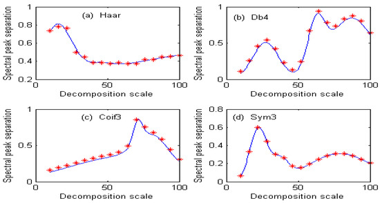 As can be seen from Table 1, the fitting accuracy of the copper information ratio is good, reaching above 0.99 under different wavelet functions, and the root mean square error (RMSE) is very small. As can be seen from Figure 4, the distribution of the copper information ratio is completely different under different wavelet functions. Figure 4a uses the Haar wavelet function. With the increase in the decomposition scale, the information ratio of copper changes very sharply, and the information ratio value is higher when the decomposition scale is 30–60. Figure 4b shows the use of the Db4 wavelet function. The overall information ratio of copper shows a decreasing trend, and the maximum value is only 0.28. Figure 4c shows the use of the Coif3 wavelet function. The information ratio fluctuates greatly, and the information ratio changes slowly when the decomposition scale is greater than 50. Figure 4d shows the use of the Sym3 wavelet function. The information ratio decreases rapidly. Because of the low sensitivity of copper, it is seriously masked by cobalt at the same concentration, so the information ratio of copper after the second-order wavelet transform is small.
