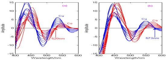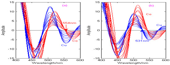 As can be seen from Figure 11, Figure 12, Figure 13 and Figure 14, the spectral signals of Cu and Co are processed by the Haar, Db4, Coif3, and Sym3 wavelet functions, and the concentrations of Cu and Co can be determined simultaneously by combining the zero-crossing technology. Figure 11 shows the second-derivative spectra of Cu and Co, which are obtained by the Haar wavelet. Figure 11a shows that the optimal decomposition scale x is 30, which is beneficial for establishing the calibration curve of Cu at the zero-crossing wavelength (529 nm) of Co. Figure 11b shows that the optimal decomposition scale x is 67, which is beneficial for establishing the calibration curve of Co at the zero-crossing wavelength (573 nm) of Cu. Figure 12 shows the second-derivative spectra of Cu and Co, which are obtained by the Db4 wavelet. Figure 12a shows that the optimal decomposition scale x is 55, which is beneficial for establishing the calibration curve of Cu at the zero-crossing wavelength (554 nm) of Co. Figure 12b shows that the optimal decomposition scale x is 42, which is beneficial for establishing the calibration curve of Co at the zero-crossing wavelength (531 nm) of Cu. Figure 13 shows the second-derivative spectra of Cu and Co, which are obtained by the Coif3 wavelet. Figure 13a shows that the optimal decomposition scale x is 60, which is beneficial for establishing the calibration curve of Cu at the zero-crossing wavelength (516 nm) of Co. Figure 13b shows that the optimal decomposition scale x is 53, which is beneficial for establishing the calibration curve of Co at the zero-crossing wavelength (542 nm) of Cu. Figure 14 shows the second-derivative spectra of Cu and Co, which are obtained by the Sym3 wavelet. Figure 14a shows that the optimal decomposition scale x is 47, which is beneficial for establishing the calibration curve of Cu at the zero-crossing wavelength (513 nm) of Co. Figure 14b shows that the optimal decomposition scale x is 69, which is beneficial for establishing the calibration curve of Co at the zero-crossing wavelength (562 nm) of Cu. Therefore, the calibration curves of Cu and Co can be obtained by derivative spectrometry combined with zero-crossing technology, and the simultaneous detection of Cu and Co in zinc solution can be realized. The correction equations of Cu and Co under different wavelet functions are shown in Table 4.