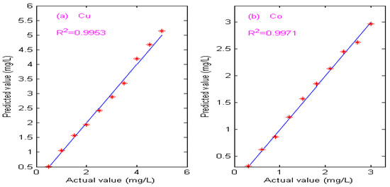 Calibration curve of predicted value and actual value. (a) Calibration curve of Cu. (b) Calibration curve of Co.
