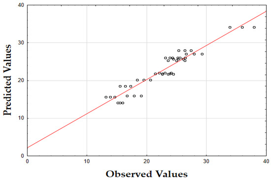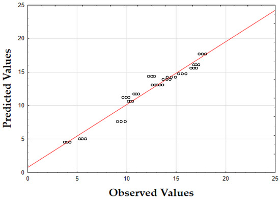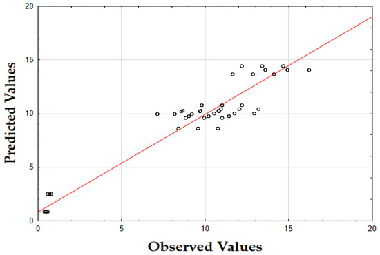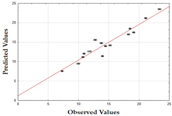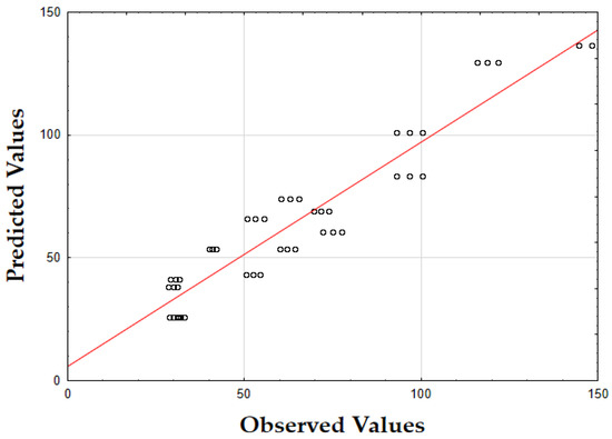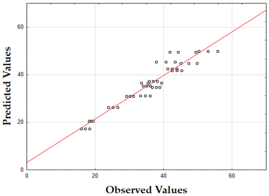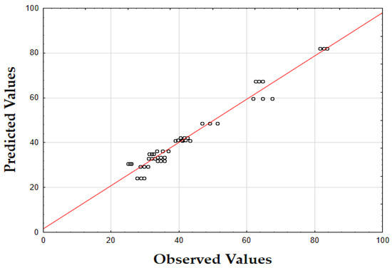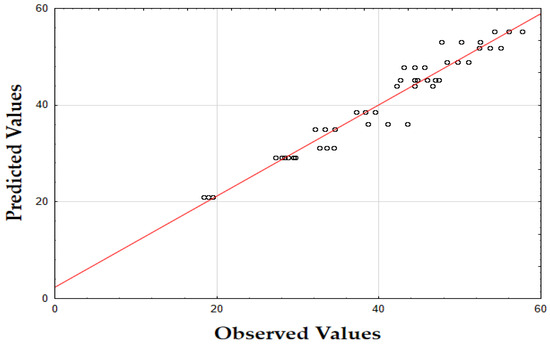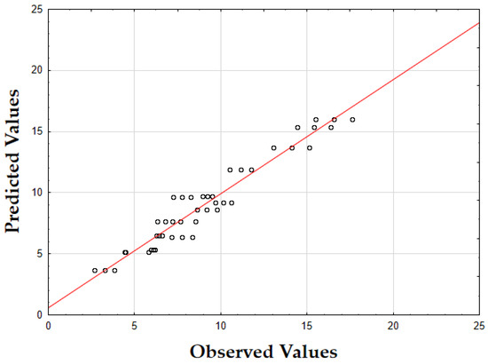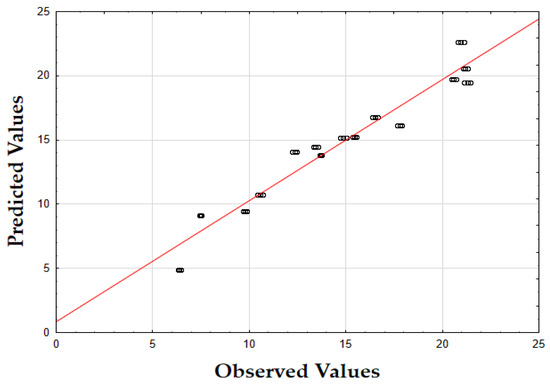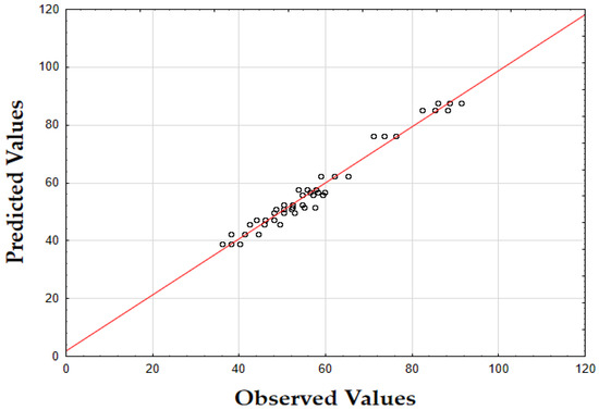 The updated model demonstrated a good fit with an R2 value of 0.91. The data points closely align with the predicted values, confirming the model’s accuracy. Finally, as shown in Figure 7, the data points are closely grouped along the diagonal, indicating very little difference between the predicted and observed extraction yield (Y) values [62]. This suggests that the errors were minimal across the entire value range, demonstrating that the model reliably and accurately predicted the extraction yield of rosemary extracts.