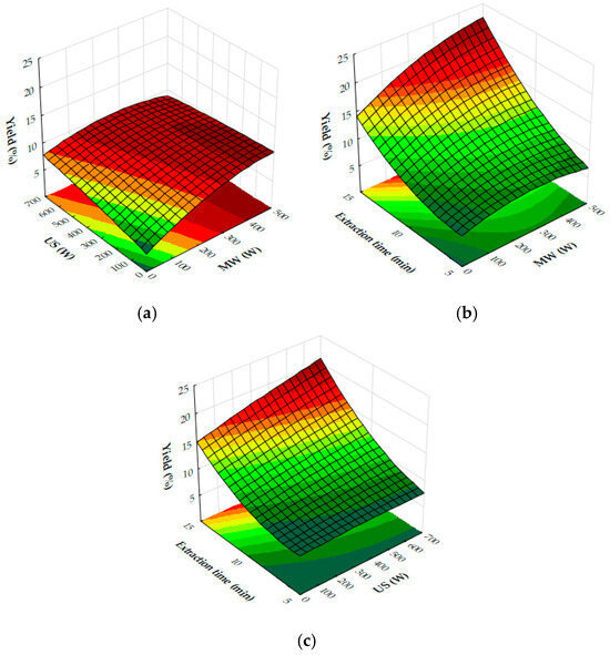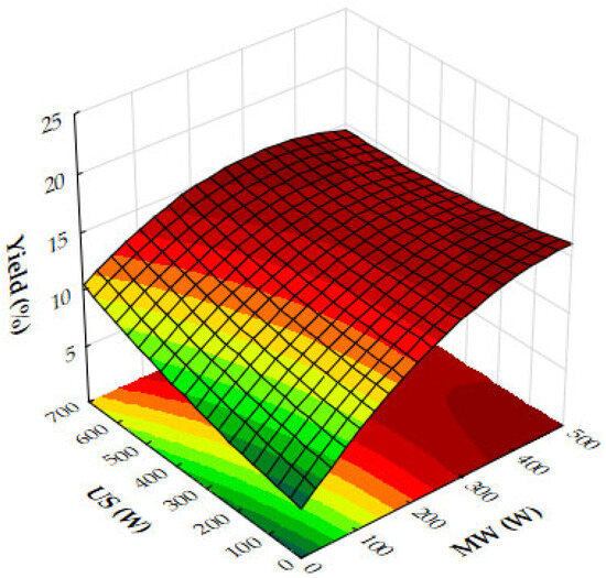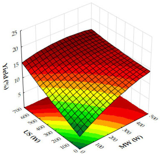These results suggest that extraction time, microwave power, and ultrasound power are the most critical factors influencing the extraction yield. A new regression analysis was performed, excluding the non-significant variables. The updated fitted surface model is expressed as: