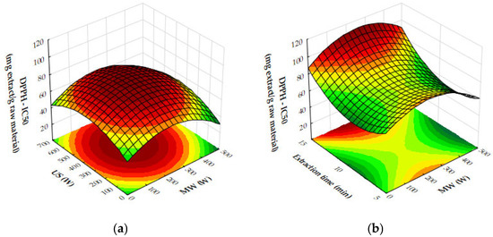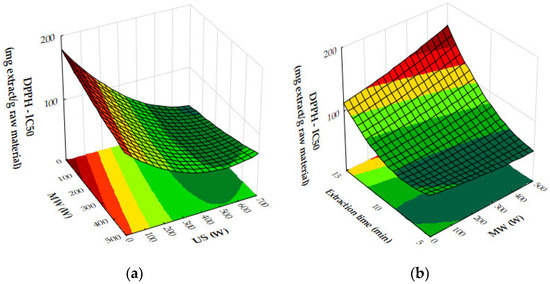 Response surface and contour plots showing the effects of MW power, US power, extraction time on IC50 (mg extract/g raw material) values of oregano extracts. (a) MW power vs. US power (extraction time: 8 min); (b) MW power vs. extraction time (US power: 450 W).