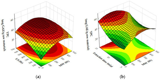 Response surface and contour plots showing the effects of MW power, US power, extraction time on TPC (mg GAE/g raw material) values of oregano extracts. (a) MW power vs. US power (extraction time: 8 min); (b) MW power vs. extraction time (US power: 450 W).