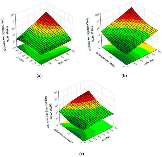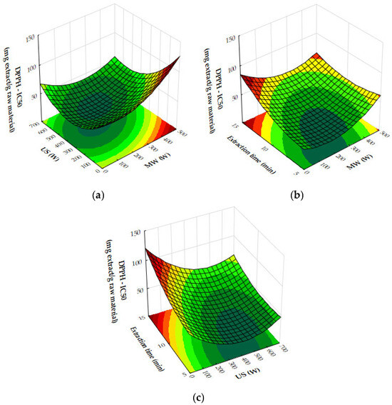 Response surface and contour plots showing the effects of MW power, US power, extraction time on IC50 (mg extract/g raw material) values of rosemary extracts. (a) MW power vs. US power (extraction time: 8 min); (b) MW power vs. extraction time (US power: 450 W); (c) US power vs. extraction time (MW power: 200 W).
