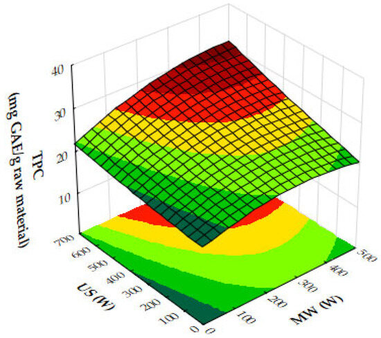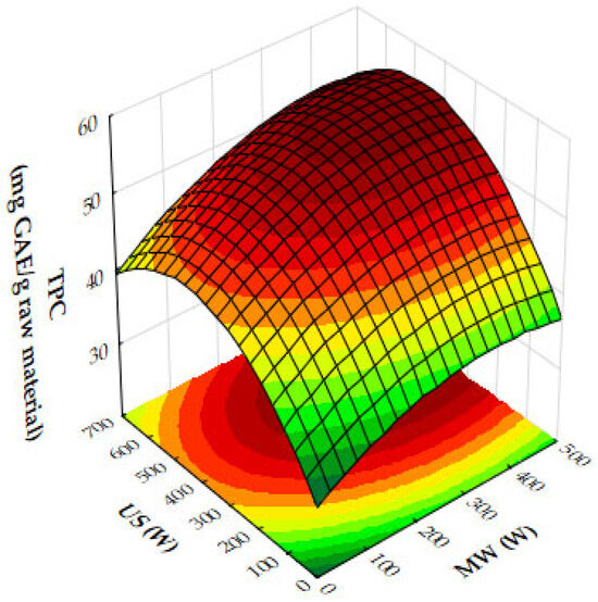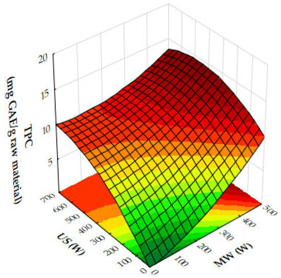 In Figure 10a, the plot demonstrates that increasing both microwave (MW) and ultrasound (US) power significantly enhances antioxidant activity, as seen through decreasing IC50 values. The strongest antioxidant activity is observed when MW power is in the range of 400–500 W and US power is between 600 and 700 W. Beyond these power levels, further increases lead to diminishing returns, indicating that the maximum antioxidant capacity has been reached under these conditions. Figure 10b illustrates the influence of MW power and extraction time on IC50 values. As MW power increases to 300 to 500 W and extraction time extends to 10 to 12 min, the IC50 values decrease, reflecting an improvement in antioxidant activity. However, once these thresholds are exceeded, the reduction in IC50 values plateaus, suggesting limited additional gains in antioxidant performance. In Figure 10c, the combined effects of US power and extraction time similarly show that stronger antioxidant activity is achieved with US power levels ranging from 400 to 700 W and extraction times of 10 to 12 min. Beyond these ranges, further increases in US power or extraction time result in diminishing returns, with no significant improvement in antioxidant activity. Finally, Figure 11 demonstrates the impact of both MW and US power on total phenolic content (TPC). The plot indicates that the most effective phenolic recovery occurs when MW power is set between 300 and 500 W and US power is in the range of 500–700 W. Beyond these optimal levels, further increases in either MW or US power provide minimal additional benefit, as the TPC values begin to plateau.