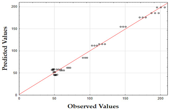 The F-value of 532.74 and the p-value of 0.00 indicate high significance in predicting TPC. The R2 value of 0.88 confirms that the model explains a substantial portion of the variability. As shown in Figure 3, the predicted values closely match the actual values, with data points tightly clustered along the diagonal. This close alignment indicates minimal deviations between the observed and predicted TPC values [60]. The small errors across the data range suggest that the model effectively captures the factors affecting the total phenolic content in oregano extracts.