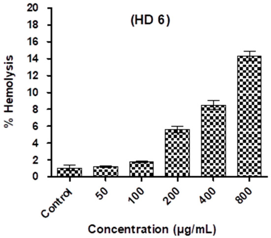 The in vitro toxicity of compound HD6 was evaluated through the procedure of hemolytic assay to investigate its effects on human red blood cells (hRBCs) across a range of concentrations from 50 to 800 μg/mL, with ciprofloxacin as a control standard. Our findings show that at concentrations up to 100 μg/mL, HD6 does not induce significant hemolysis, with less than 4% of RBCs undergoing lysis exhibiting non-toxicity. However, at a high concentration of 400 μg/mL, the lysis observed increased to 8% (Figure 2).
