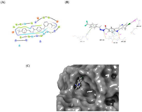 (A) Two-dimensional interaction diagram of the biofilm-associated protein with the ligand HD6. (B) Three-dimensional interaction diagram of the protein complex. (C) Surface representation of the protein–ligand complex.