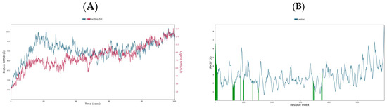 (A) RMSD of the protein–ligand complex. (B) RMSF of the protein–ligand complex. Green line in the figure represents the specific amino acid residues which are taking part in the interaction with the ligand.