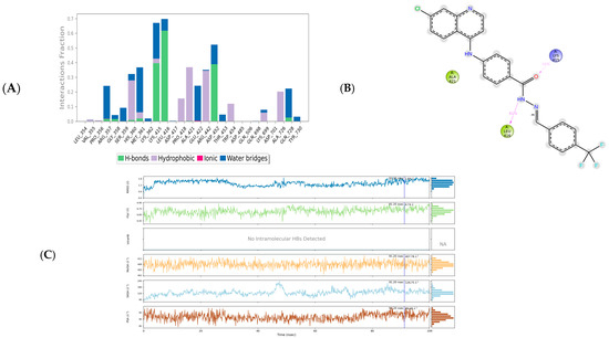 When analyzed in a protein–ligand 2D interaction diagram, the best complex was selected based on the highest number of hydrogen-bond interactions and high binding energy to perform molecular dynamics (MD) simulation. The Desmond module was employed from Schrödinger Release 2022-4, running on a Linux system. MD simulation captures the dynamic stability of every atom of the protein–ligand complex at every point in time, mimicking the living system. The simulation utilized the Optimized Potentials for Liquid Simulations (OPLS4) force field at pH 7.4. To identify the most suitable binding complexes, we conducted a 100 ns simulation. This process involved placing the protein and selected complex in an orthorhombic box and solvating them with water molecules. To balance charges and maintain a salt concentration of 0.15 M, we introduced Na+ and Cl− ions. Throughout the simulation, we kept a constant temperature of 300 K and a pressure of 1.01325 bar. Following established protocols, we recorded data at 5 ps intervals [74]. The stability of the ligand–protein complex was assessed by analyzing parameters such as root mean square deviation (RMSD), root mean square fluctuation (RMSF), and the values of secondary structure elements (SSE). Additionally, we examined the interactions between ligand and amino acid residues for each trajectory frame. We also assessed conformation during the 100 ns simulation by evaluating the radius of gyration (Rg) and solvent-accessible surface area (SASA) [75,76,77,78,79,80].