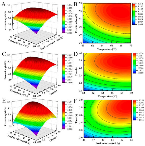 3D response surface plots (A,C,E) and contour plots (B,D,F) showing the interaction effects on the naringin extraction yield; (A,B) exaction-temperature- and exaction-feed-to-solvent ratio; (C,D), exaction temperature and exaction time; (E,F),exaction feed to solvent ratio and exaction time.