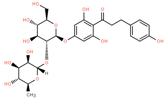 At a room temperature of 25 °C, purified naringin (5.0 g) was placed in a stainless steel high-pressure reactor. Thereafter, NaOH solution was slowly added to obtain a reaction solution with pH 14. Next, excess 10% palladium carbon catalyst was also added, and the pressure and temperature of the reactor were maintained at 1.6 MPa and 50 °C, respectively. The reactor was then placed on a magnetic stirrer, and hydrogen gas was introduced for 3 h before the reaction commenced. After 1 h, the hydrogen valve was closed to maintain the reaction rate. After 12 h, when the reaction reached completion, the product was filtered to recover the catalyst. Then, the filtrate was removed from the NaOH solution using 732 cation exchange resin, and the hydrogenation product was obtained after standing, filtering, and drying [50]. Under these conditions, the obtained yield of naringin dihydrochalcone was 92.35%.