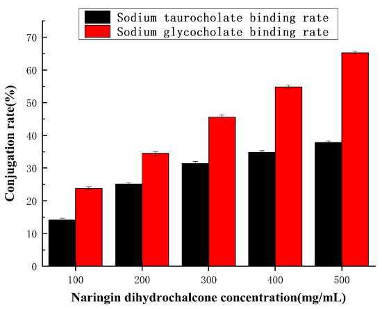 Bile acid salts are mainly concentrated in the bile of humans and animals and play an important role in the metabolism and absorption of lipids, cholesterol, fat-soluble vitamins, and other substances. Based on a simulated gastrointestinal environment, the in vitro lipid-lowering effect of naringin dihydrochalcone was evaluated by detecting its binding ability with two typical bile acid salts. As seen in Figure 4, with an increase in naringin dihydrochalcone concentration, the binding rate of sodium glycocholic acid and sodium taurocholate increases significantly (p < 0.05). When the concentration of naringin was 0.5 mg/mL, the binding rate of naringin dihydrochalcone and sodium glycocholic acid was 65.29 ± 0.36%, and that of naringin dihydrochalcone and sodium taurocholate was 37.84 ± 0.24%, indicating that the binding capacity of naringin dihydrochalcone and sodium glycocholic acid was stronger than that of sodium taurocholate. This may be related to the spatial structure of naringin dihydrochalcone molecules, and the specific reasons need to be further confirmed. Therefore, the higher the binding rate of naringin dihydrochalcone with sodium glycocholic acid and sodium taurocholate, the higher the binding capacity of sodium cholate, the stronger the blood lipid-lowering function, and the more significant the blood lipid-lowering effect [22,23]. The in vitro lipid-lowering test method is simple, has a short cycle, and has relatively few influencing factors. One of the important methods for identifying in vitro lipid-lowering activity is to determine the binding ability of the sample to bile salts. Bile acids are divided into free and bound bile acids, which are synthesized by the liver and flow into the intestine with bile secretions in the bile ducts. Free bile acids undergo passive reabsorption, combined with active reabsorption, to form a complete hepatic intestinal circulation system and regulate the bile acid content in the body to maintain a balanced and stable level. At present, there are few studies on the in vitro lipid-lowering effect of naringin dihydrochalcone. Therefore, by simulating the gastrointestinal environment and based on the binding effect of naringin dihydrochalcone on glycylcholic acid and bovine bile acid, the lipid-lowering effect of naringin dihydrochalcone is explored in order to provide an experimental basis for further research on the active function of naringin dihydrochalcone [24,25].
