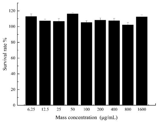 The inhibitory effects of nine concentrations of naringin dihydrochalcone on HepG2 liver cancer cells are shown in Figure 5, which shows that at mass concentrations in the 6.25–1600 μg/mL range, the survival rate of the HepG2 cells is greater than 99.00%. This indicates that within this concentration range, naringin dihydrochalcone has no effect on the survival rate of HepG2 cells, and there is no significant difference compared to the control group (p > 0.05). Thus, subsequent experiments could be conducted using samples with concentrations in this range.