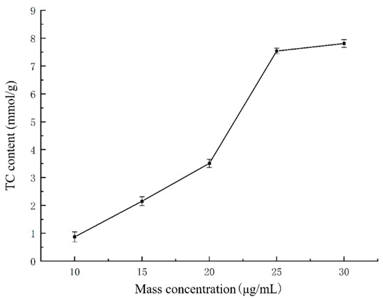 At a room temperature of 25 °C, when HepG2 liver cancer cells covered 80–90% of the bottom of the cell incubation bottle, the cells were digested with tripsin, suspended, and counted. Thereafter, the cells at a concentration of 2 × 105 cells/mL were inoculated into a 96-well plate and incubated in a 5% CO2 incubator for 24–48 h. When the cell monolayer reached the bottom of the well plate, the culture medium was replaced with serum-free medium, and cholesterol solutions of different mass concentrations (10, 15, 20, 25, and 30 μg/mL) were added. After incubation for 24 h, the culture medium was discarded, and the cells were washed three times with phosphate-buffered saline (PBS). The HepG2 cells were further digested using trypsin, and the cell suspension obtained was transferred into a centrifuge tube. Centrifugation was performed at 1500 r/min for 4 min. After this step, the supernatant was discarded and the residue was washed with PBS. Centrifugation was further performed, and the resulting supernatant was discarded. The cell residue was then resuspend in PBS and crushed using a cell crusher. The concentration of cholesterol in each cell group was then determined in accordance with the instructions provided with the reagent kit [56].