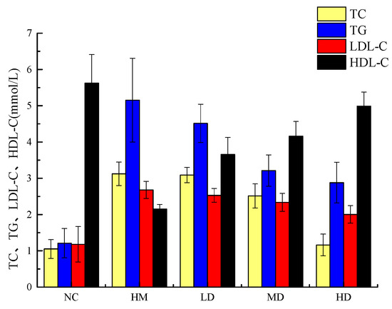 At a room temperature of 25 °C, when HepG2 cells in the cell culture bottle covered 80–90% of the bottom of the bottle, the cells were digested with trypsin, centrifuged, and diluted to a given concentration. This was followed by inoculation into a 96-well plate; the addition of 2.5 mL cholesterol at 10, 20, and 40 mg/kg to the complete culture medium; and incubation for 24 h. The supernatant was aspirated, and the residue was digested using trypsin, was centrifuged, and was washed with PBS three times. Finally, 250 μL of 1% TritonX-100 was added followed by cracking in an ice bath at 4 °C for 30–40 min and the detection of TG, TC, LDL-C, and HDL-C levels according to instructions stated in the reagent kits.