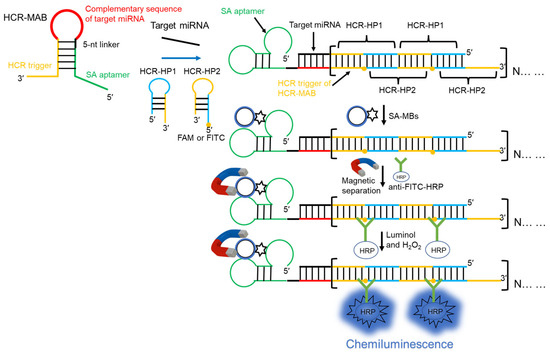 SA-MBs (5 mg/mL, 1 μm) were purchased from Polysciences, Inc. (Warrington, PA, USA). The antibody of fluorescein isothiocyanate isomer conjugated horseradish peroxidase (anti-FITC-HRP) was purchased from Takara Biomedical Technology Co., Ltd. (Beijing, China). Immobilon Western HRP substrate, including a solution of luminol and H2O2, was purchased from Millipore. The washing buffer (WB, pH 8.0) consisted of 7 mM Tris-HCl, 130 mM NaCl, and 0.05% Tween-20. The hybridization buffer (BA, pH 8.0) contained 20 mM Tris-HCl, 500 mM NaCl, and 20 mM Mg2SO4. All DNA hairpins and probes were synthesized and purified by Sangon Biotech Co., Ltd. (Shanghai, China). Shanghai GenePharma Co., Ltd. (Shanghai, China) synthesized all miRNAs. This study employed DNA hairpins and target miRNAs, such as HCR-MAB-let7a (80 mer), HCR-MAB-146b (81 mer), HCR-HP1 (48 mer), HCR-HP2 (48 mer), miR-let7a (22 nucleotides), miR-let7d (21 nucleotides), miR-146a (22 nucleotides), and miR-146b (23 nucleotides). The base sequences of these DNA hairpins and target miRNAs are shown in Table S2.