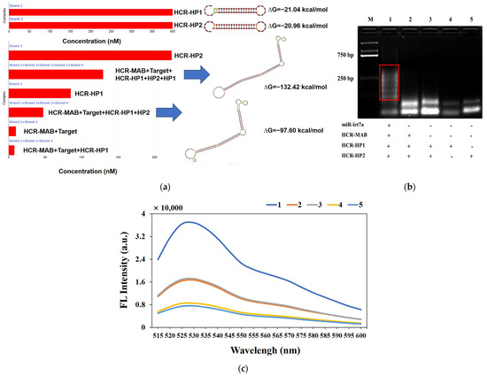 (a) Simulation of the HCR primers and products by NUPACK: the different colors of dots represented the equilibrium probability of hairpins primers and HCR products structures, the red box represented the concentrations of different hairpins primers and HCR products, the blue arrows represented the corresponding structure of HCR products; (b) agarose gel electrophoresis of HCR reaction: lane 1: miR-let7a (10 pmol) + HCR-MAB-let7a (10 pmol) + HCR-HP1 and HP2 (20 pmol), lane 2: HCR-MAB-let7a (10 pmol) + HCR-HP1 and HP2 (20 pmol), lane 3: HCR-HP1 and HP2 (20 pmol), lane 4: HCR-HP1 (20 pmol), lane 5: HCR-HP2 (20 pmol); (c) fluorescence spectrum of EvaGreen within the solution of HCR reaction products: 1: miR-let7a (2 pmol) + HCR-MAB-let7a (10 pmol) + HCR-HP1 and HP2 (20 pmol), 2: HCR-MAB-let7a (10 pmol) + HCR-HP1 and HP2 (20 pmol), 3: HCR-HP1 and HP2 (20 pmol), 4: HCR-HP1 (20 pmol), 5: HCR-HP2 (20 pmol).