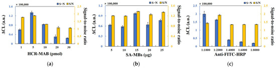 All experimental conditions, including the amount of MAB primer, HCR-HP1, HCR-HP2, and SA-MB; and the different dilution ratios of anti-FITC-HRP were optimized (see Figure 3a–c). Briefly, the following experimental conditions were deemed optimal for efficient target miRNA detection: concentrations of MAB primer and HCR-HP1/HCR-HP2, 5 pmol and 10 pmol, respectively; the amount of SA-MB, 15 μg; the dilution ratio of anti-FITC-HRP, 1:2000.