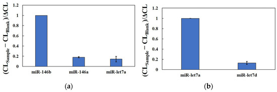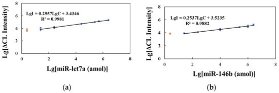 Under the optimal reaction conditions, a linear regression curve using standards of different concentrations of miR-146b and miR-let7a (25 amol–2.5 pmol) was determined, where ΔCL represents the difference between the CL intensity of the sample and blank solutions with the reaction solution without the addition of target miRNA as the blank group. As shown in Figure 4a,b, the ΔCL increase in the HCR-CL system with the increase in target miRNA content had a lower limit of quantification of 25 amol (final concentration of 250 fmol/L) and a minimum detected amount of 2.5 amol (final concentration of 25 fmol/L). The linear regression equations for miR-let7a and miR-146b were LgI = 0.2957LgC + 3.4346, R2 = 0.9981, and LgI = 0.2537LgC + 3.5235, R2 = 0.9882, where I is the CL intensity and C is the target miRNA concentration.