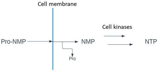 Nucleoside analogs are widely applied in antiviral therapy [2,3,4]. Nucleoside/nucleotide analogs are prodrugs because after entering the cell, they must be phosphorylated by cellular kinases to the corresponding mono-, di-, and triphosphates (ddNTPs), which are proper inhibitors of viral RNA synthesis. However, some of these compounds (e.g., ddU) were found to be weak substrates for cell kinases [5], making them therapeutically useless. Due to several limitations of nucleoside-based drugs, the idea of pronucleotides arose. They were designed to bypass the first, but crucial, and at the same time, most therapeutically chimeric step of the phosphorylation of the nucleoside analog to monophosphate in the cell [6,7]. According to this concept, a prodrug would be a properly protected nucleotide-pronucleotide, from which, after entering the cell, the protective groups of the phosphate residue are removed (as a result of chemical hydrolysis or/and with the participation of cellular enzymes), and the nucleoside 5′-monophosphate is released and then phosphorylated to diphosphates and, finally, to biologically active nucleoside 5′-triphosphates [8] (Figure 1). This approach has been successfully applied for the development of antiviral drugs (e.g., for the treatment of HIV, HCV, or, recently, SARS-CoV-2) [9,10,11,12,13,14].