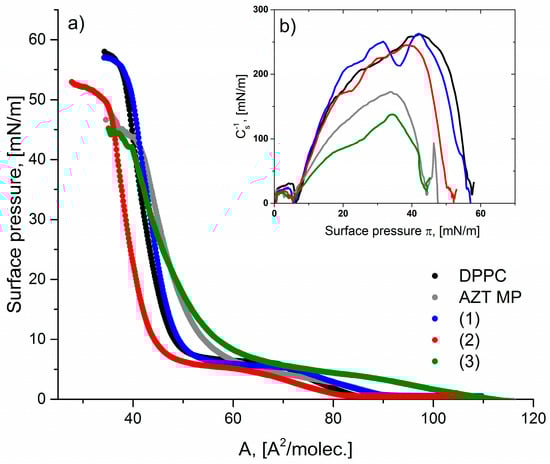The DPPC isotherm has a characteristic phase transition region in the pressure range of 5–7 mN/m. The surface pressure value does not change with the compression of the DPPC monolayer, indicating the coexistence of two phases, i.e., LE and LC, in the formed lipid film [51]. In the LC/LE phase coexistence region, the DPPC film becomes a mesh of finely divided LC/LE domains. This specific structure of the film has been shown to be associated with density fluctuations, which may contribute to the flexibility and strength of the monolayer of lipids [52]. This characteristic transition is also clearly visible as a horizontal plateau in the run of the π–A isotherm obtained for the DPPC/AZTMP, DPPC/(1), and DPPC/(2) systems. No plateau can be seen in the course of the π–A isotherm for derivative (3). The addition of this compound to the subphase causes a stronger fluidization of the phospholipid monolayer. The presence of derivative (3) impacts the interactions between DPPC molecules, which is reflected in the change in the π–A isotherms run (Figure 2a). Cutro et al. [53] have suggested that this behavior can be ascribed to a different conformation of the phenyl group on the aqueous phase. They have found that phenyl group inserts in open spaces in the DPPC monolayers result in a higher area per lipid and lower compressibility. This insertion would account for the partial disappearance of the coexistence in the DPPC curves, as shown for derivative (2), and the total disappearance for derivative (3) (Figure 2a).