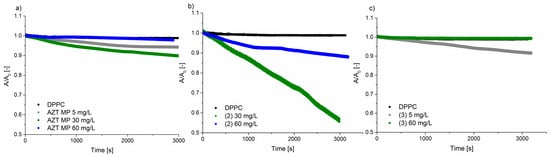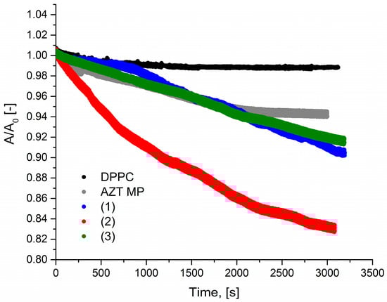 In our study, we investigated how the small difference in the chemical structure of the AZTMP derivative impacts the model membrane. Thus, we chose two derivatives with polar ((1) and (2)) and uncharged molecules (3). As presented in Figure 3, the run of the relaxation curve for derivative (2) differed significantly from the other systems. The degradation process was very intensive because 10% of the film was lost after 15 min, and finally, 20% of the film was degraded after 50 min. The molecules of derivative (2) interacted particularly strongly with the lipid film in contrast to derivative (3).