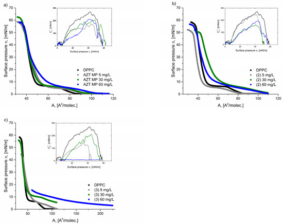 Surface pressure–area per molecule (π–A) isotherms and compression modulus–surface pressure (Cs−1–π) insert graphs for the analyzed systems: (a) AZTMP, (b) derivative (2), and (c) derivative (3) at different concentrations: 5, 30, and 60 mg/L.