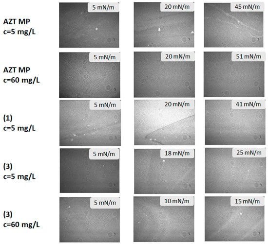 The images for the DPPC with AZTMP, DPPC/(1), and DPPC/(3) systems indicate the formation of mixed films with different morphology. The DPPC/AZTMP mixed monolayer had a morphology similar to that of the DPPC film. The formation of three-dimensional structures was visible close to the collapse point. In the case of a much higher concentration (at 60 mg/L), the aggregates were not visible. However, the coexistence of two phases, i.e., liquid and condensed, is clearly visible for the system containing derivative (1), especially at a surface pressure of 20 mN/m. Further compression caused this effect to disappear. The mixed monolayer consisting of DPPC and derivative (3) molecules formed the film with the two phases co-existing and was visible all the time during the compression of the film. The influence of concentration on film morphology was particularly visible for the mixture containing AZTMP molecules. A 12-fold increase in the particle concentration of AZTMP in the subphase caused the formation of a densely packed and uniform film at the beginning of the condensing process. As a result, the created film was so stable that the morphology did not change during compression, opposite to the monolayer formed by a lower amount of AZTMP molecules.