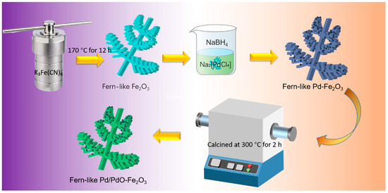 The preparation process is displayed in Figure 1. Specifically, 0.5 g of K3Fe(CN)6 was dispersed in 70 mL of distilled water to create a suspension, and the pH was adjusted to 8.0 using 0.1 M ammonia solution. This mixture was then transferred to a 100 mL Teflon-lined stainless-steel autoclave, which was sealed and heated at 170 °C for 12 h before cooling naturally. The resulting product was collected via centrifugation, washed multiple times with deionized water and absolute ethanol, and finally dried in a vacuum at 60 °C, yielding red fern-like Fe2O3. As for fern-like Pd/PdO-Fe2O3, 0.05 g of fern-like Fe2O3 microspheres was dispersed in deionized water under ultrasonic treatment, followed by the addition of 1 mL of Na2[PdCl4] (2 mmol L−1) with vigorous agitation. Then, 1 mL of deionized water containing 0.4 mg of NaBH4 was added dropwise to the mixture. After being stirred for approximately 2 h, the mixture was washed with deionized water and absolute ethanol, and then centrifuged. The final powder was calcined at 300 °C for 2 h and labeled as fern-like Pd/PdO-Fe2O3.