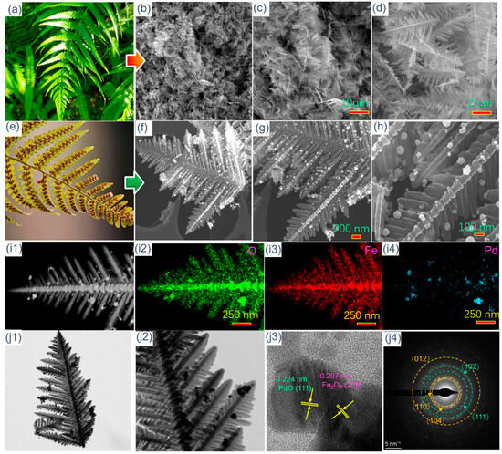 (a) An optical figure of the fern blade in (a) spring and (e) autumn; SEM images of (b–d) fern-like Fe2O3 and (f–h) fern-like Pd/PdO-Fe2O3; (i1) HAADF image and the corresponding EDS elemental mapping images of (i2) O, (i3) Fe, and (i4) Pd, respectively; (j1–j2) TEM, (j3) HRTEM images, and (j4) area diffraction pattern of fern-like Pd/PdO-Fe2O3.