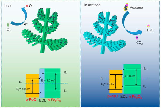 Schematic demonstration of the sensing mechanism of fern-like Pd/PdO-Fe2O3-based sensor toward acetone.