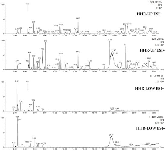 LC/MS BPI chromatogram (ESI+ and ESI−) of the extracts HHR-UP and HHR-LOW.