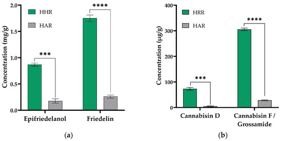 Quantification of triterpenes and cannabisins in HHRs and HARs. (a) Quantification of triterpenes from DMSO extracts of HHRs and HARs using GC-FID. Significantly higher amounts of triterpenes have been quantified in HHRs compared to HARs. Data are shown in mg/g. (b) Quantification of cannabisins from methanolic extracts of HHRs and HARs using UHPLC-QToF. Significantly higher amounts of cannabisins have been quantified in HHRs compared to HARs. Data are shown in µg/g. The values are displayed as the mean ± standard deviation of the biological triplicate (n = 3) and the technical triplicate (n = 3). Significant differences are indicated by asterisks: ***, p < 0.001; ****, p < 0.00001.