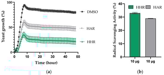Antifungal and antioxidant activities of HHR and HAR non-polar extracts: (a) Inhibition of Saccharomyces cerevisiae growth over time by 200 µg of HHR and HAR non-polar extracts prepared at 100 mg/mL in DMSO with DMSO as a negative control. (b) Radical Scavenging Activity shows as gallic acid equivalent, showing assessment of HHR and HAR non-polar extract antioxidant activities at 10 µg in reaction to ABTS solution. The values are displayed as the mean ± standard deviation of the technical replicate (n = 3).
