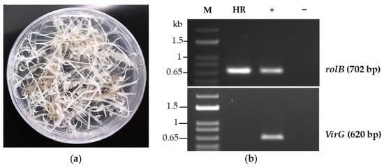 Establishment of hemp hairy root clones. (a) Selected hemp hairy root clone in solid culture media. (b) PCR analysis of HHR transformed with R. rhizogenes to verify the presence of rol B (T-DNA marker) and Vir G genes (R. rhizogenes marker). The DNA of R. rhizogenes was used as positive control (+) and water as negative control (−).