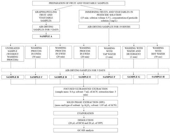 The study aimed to check the effectiveness of removing selected pesticides (malathion, fenitrothion, and p,p′-DDT) from the surfaces of lemons and vegetables using commercial kitchen EWDs. To the best of our knowledge, the removal of pesticides from vegetables and fruits using kitchen EWDs remains largely unknown. The effectiveness of EWDs was additionally compared with traditional methods: washing with tap water, washing with water and detergent, and washing with hot water.
