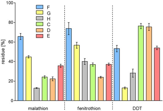 As a result of the experiments carried out for lemon and selected vegetables (previously soaked in an aqueous solution of pesticides—sample B; using treatment methods with EWDs (samples C–E) and with water (samples F–H), many samples were obtained that were subjected to GC/MS analysis (Figure 1). Based on the chromatograms, the residue % was calculated by dividing the average analyte signal for samples (samples C–H), i.e., after the clean-up method applied by the average analyte signal for the untreated sample (sample B in Figure 1). After the EWDs treatment, the content of malathion and fenitrothion decreased in the lemon peel to approximately 20–40% of the initial concentration (Figure 2). These pesticides have relatively good solubility in water (Table S1). The agents used in EWD kitchen cleaners (electrolyzed water, ultrasonic waves, and UV light) promote the removal of these compounds from the lemon surface. This is additionally facilitated by their degradation, as described in previous studies on pesticide degradation in water. Moreover, the LogP for malathion and fenitrothion is approximately 3 (Table S1), which does not indicate strong sorption of these compounds onto the fruit surface. Traditional methods of washing lemons (tap water—sample F; water and detergent—sample G; hot water—sample H) are also effective, although to varying degrees, in removing pesticides (Figure 2) from the surface of the fruit. An increase in the efficiency of the washing process can be observed in the case of additional agents, i.e., detergent or elevated temperature.