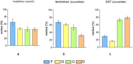 Pesticide residues in vegetables after different treatment methods: samples treated in/with F—tap water; G—water and detergent; C—EWD1; D—EWD2: (a) malathion, (b) fenitrothion, (c) DDT. Error bars represented by SEM: if their ranges overlap, there are no significant differences between the compared values.