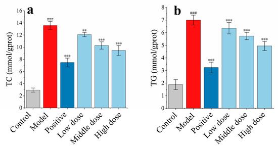 The effect of FFN on TC and TG contents in HepG2 cells induced by sodium oleate (n = 6): (a) the effect of FFN on TC; (b) the effect of FFN on TG. Compared with blank group, ### p < 0.001; compared with model group, ** p < 0.01, *** p < 0.001.