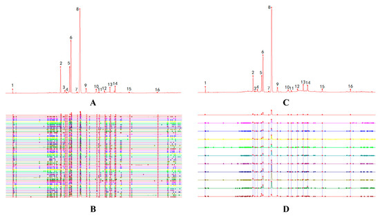 The reference chromatogram and fingerprints of N. nucifera and FFN (rutin (peak 3), hyperoside (peak 5), isoquercitrin (peak 6), quercetin–3–O–β–D–glucuronide (peak 8), astragalin (peak 9), quercetin (peak 14), and kaempferol (peak 15)): (A) the reference chromatogram of N. nucifera; (B) the fingerprints of N. nucifera; (C) the reference chromatogram of FFN; (D) the fingerprints of FFN.