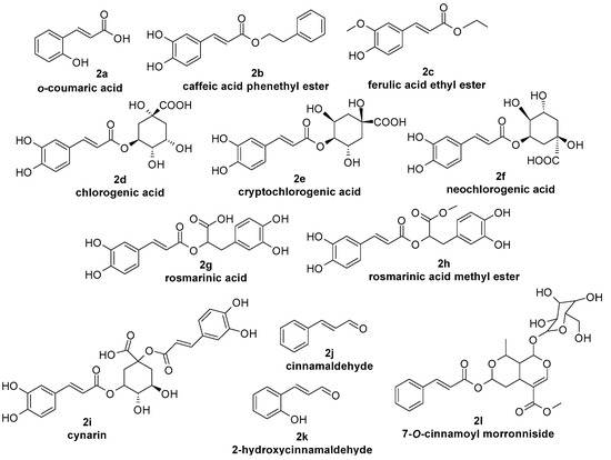 | Cinnamaldehyde Figure 2, 2j | Non-competitive [98,100] | |