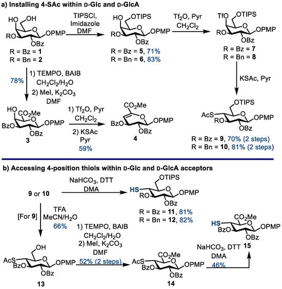 A suspension of p-methoxyphenyl 4-S-acetyl-2,3-di-O-benzoyl-β-d-glucopyranoside 13 (602 mg, 1.09 mmol, 1.00 equiv.) in CH2Cl2/H2O (6 mL, 2/1) was treated with TEMPO (34.0 mg, 0.218 mmol, 0.20 equiv.) and BAIB (879 mg, 2.73 mmol, 2.50 equiv.) at 0 °C. The reaction was stirred at RT for 1 h. A TLC analysis (14/7/1, EtOAc/MeOH/H2O) of the resulting brown reaction mixture showed the complete conversion of the starting material to a lower Rf spot. The reaction was quenched with Na2S2O3 (5 mL) and diluted with EtOAc (10 mL). The aqueous layer was separated and acidified to pH = 2 using 1 M HCl and extracted with EtOAc (5 × 10 mL). The combined organic layers were washed with brine (50 mL), dried over anhydrous MgSO4, filtered, and concentrated in vacuo to give a yellow solid. A suspension of this crude material and K2CO3 (452 mg, 3.27 mmol, 3.00 equiv.) in DMF (3.7 mL) was treated with the dropwise addition of MeI (202 µL, 3.27 mmol, 3.00 equiv.) at 0 °C. The reaction was stirred at RT for 2 h, whereupon a TLC analysis (1/1, hexane/EtOAc) revealed the full conversion of the starting material to a higher Rf spot. The reaction mixture was diluted with CH2Cl2 (20 mL) and washed with H2O (30 mL). The aqueous layer was separated and extracted with CH2Cl2 (2 × 30 mL). The organic layers were combined and washed with brine (60 mL), dried over anhydrous MgSO4, filtered, and concentrated in vacuo to give a brown syrup. The purification of this crude material via column chromatography (100/0 → 98/2, CH2Cl2/Et2O) generated title compound 14 as a white solid (330 mg, 0.57 mmol, 52%). Rf = 0.14 (CH2Cl2); m.p. 155–157 °C; +89.2 (c = 0.50, CHCl3); 1H NMR (400 MHz, CDCl3) δ 7.97–7.92 (m, 4H, Ph), 7.55–7.48 (m, 2H, Ph), 7.42–7.34 (m, 4H, Ph), 6.94–6.88 (m, 2H, Ph), 6.80–6.74 (m, 2H, Ph), 5.85 (dd, J = 10.9, 9.2 Hz, 1H, H3), 5.67 (dd, J = 9.2, 7.5 Hz, 1H, H2), 5.24 (d, J = 7.5 Hz, 1H, H1), 4.55 (d, J = 10.6 Hz, 1H, H5), 4.13 (t, J = 10.8 Hz, 1H, H4), 3.77 (s, 3H, OCH3), 3.74 (s, 3H, OCH3), 2.24 (s, 1H, SCOCH3); 13C NMR (100 MHz, CDCl3) δ 192.9 (SC=O), 167.2 (C=O), 165.6 (C=O), 165.1 (C=O), 155.8 (Cq), 151.0 (Cq), 133.5 (CH), 133.3 (CH), 130.0 (CH), 129.8 (CH), 129.1 (Cq), 128.8 (Cq), 128.44 (CH), 128.41 (CH), 118.9 (CH), 114.5 (CH) 100.9 (C1), 74.4 (C5), 72.6 (C2), 70.6 (C3), 55.6 (OCH3), 52.9 (SCOCH3), 44.9, (C4) 30.8 (OCH3). HRMS (ESI+) m/z found (M+NH4)+ 599.1776; C30H32NO10S requires 599.1774.