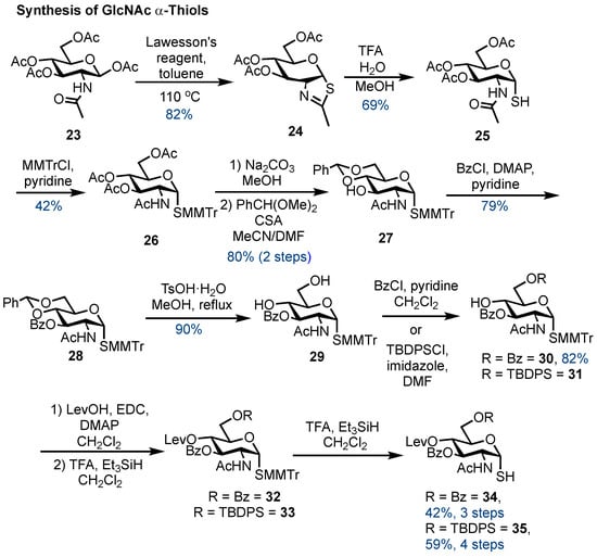 A solution of p-monomethoxytrityl 2-acetamido-3,6-O-dibenzoyl-2-deoxy-1-thio-α-d-glucopyranoside 30 (855 mg, 1.00 mmol, 1.00 equiv.) in CH2Cl2 (2 mL) was treated with levulinic acid (163 mL, 1.60 mmol, 1.60 equiv.), EDCI·HCl (248 mg, 1.60 mmol, 1.60 equiv.), DMAP (195 mg, 1.60 mmol, 1.60 equiv.), and DIPEA (279 µL, 1.60 mmol, 1.60 equiv.). The reaction was stirred at RT for 2 h, whereupon a TLC analysis (9/1, CH2Cl2/Et2O) revealed the full conversion of the starting material to a higher Rf spot. The reaction was diluted in CH2Cl2 (20 mL) and washed with NaHCO3 (15 mL). The aqueous layer was separated and extracted with CH2Cl2 (2 × 15 mL). The combined organic layers were washed with brine (20 mL), dried over anhydrous MgSO4, filtered, and concentrated in vacuo to yield a yellow syrup. The purification of this crude material via column chromatography (1/0 → 8/2, CH2Cl2/Et2O) generated title compound 32 as a white solid (649 mg, 0.684 mmol, 68%). Rf = 0.33 (9:1, CH2Cl2/Et2O); m.p. 81–82 °C; +35.0 (c = 0.80, CHCl3); 1H NMR (400 MHz, CDCl3) δ 8.11–8.04 (m, 2H, Ph), 7.98–7.91 (m, 2H, Ph), 7.59–7.52 (m, 2H, Ph), 7.45–7.42 (m, 4H, Ph), 7.38–7.32 (m, 4H, Ph), 7.31–7.21 (m, 9H, Ph), 6.83–6.75 (m, 1H, Ph), 5.82 (d, J = 9.6 Hz, 1H, NH), 5.45 (t, J = 9.7 Hz, 1H, H3), 5.33 (dd, J = 11.4, 9.5 Hz, 1H, H4), 4.95 (d, J = 5.3 Hz, 1H, H1), 4.65–4.58 (m, 2H, H2, H5), 4.46 (dd, J = 12.5, 2.9 Hz, 1H, H6a), 4.41 (dd, J = 12.5, 2.5 Hz, 1H, H6b), 3.77 (s, 1H, OCH3), 2.57–2.51 (m, 2H, Lev-CH2), 2.44–2.33 (m, 2H, Lev-CH2), 1.93 (s, 3H, Lev-CH3), 1.83 (s, 3H, CH3); 13C NMR (100 MHz, CDCl3) δ 205.7 (C=O), 171.3 (C=O), 169.2 (C=O), 167.0 (C=O), 166.2 (C=O), 158.6 (Cq), 144.49 (Cq), 144.47 (Cq), 136.1 (Cq), 133.5 (CH), 133.10 (CH), 131.13 (CH), 130.0 (CH), 129.84 (CH), 129.83 (CH), 129.80 (CH), 128.8 (Cq), 128.5 (CH), 128.4 (CH), 128.0 (CH), 127.30 (CH), 127.29 (CH), 113.3 (CH), 84.4 (C1), 72.4 (C4), 70.1 (Cq), 69.8 (C5), 68.3 (C3), 62.4 (C6), 55.3 (OCH3), 52.5 (C2), 37.9 (Lev-CH2), 29.4 (Lev-CH3), 27.8 (Lev-CH2), 23.3 (CH3). HRMS (ESI+) m/z found (M+Na)+ 838.2665; C47H45NO10SNa requires 838.2656.