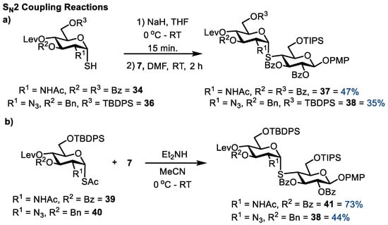S-linked disaccharide 37 was prepared following general procedure A using thiohemiacetal 34 (98.0 mg, 0.270 mmol), NaH (11 mg of a 60% dispersion in mineral oil, 0.270 mmol), and triflate 7 (318 mg, 0.405 mmol) in THF (5.8 mL). Purification via column chromatography (1/0 → 9:1, CH2Cl2/Et2O) furnished title compound 37 as a white solid (145 mg, 0.128 mmol, 47%). Rf = 0.41 (95/5, CH2Cl2/Et2O); m.p. 107–109 °C; +113.3 (c = 2.0, CHCl3); 1H NMR (400 MHz, CDCl3) δ 8.11–8.06 (m, 2H, Ph), 7.98–7.85 (m, 6H, Ph), 7.62–7.55 (m, 1H, Ph), 7.55–7.45 (m, 5H, Ph), 7.42–7.32 (m, 6H, Ph), 6.98–6.91 (m, 2H, Ph), 6.77–6.71 (m, 2H, Ph), 5.75 (dd, J = 10.9, 9.6 Hz, 1H, H3), 5.66 (d, J = 5.3 Hz, 1H, H1′), 5.55–5.49 (m, 1H, H2), 5.49 (d, J = 9.5 Hz, 1H, NH), 5.41 (t, J = 9.7 Hz, 1H, H4′), 5.22 (dd, J = 11.2, 9.5 Hz, 1H, H3′), 5.13 (d, J = 7.9 Hz, 1H, H1), 4.60 (ddd, J = 11.2, 9.2, 5.2 Hz, 1H, H2′), 4.54 (dd, J = 12.4, 2.2 Hz, 1H, H6a′), 4.46 (dd, J = 12.4, 3.7 Hz, 1H, H6b′), 4.40 (ddd, J = 10.1, 3.3, 2.5 Hz, 1H, H5′), 4.25 (dd, J = 10.9, 1.5 Hz, 1H, H6a), 4.14 (dd, J = 11.5, 4.6 Hz, 1H, H6b), 3.78–3.72 (m, 4H, OCH3, H5), 3.44 (t, J = 10.7, 1H, H4), 2.57–2.53 (m, 2H, Lev-CH2), 2.47–2.31 (m, 2H, Lev-CH2), 1.92 (s, 3H, Lev-CH3), 1.35 (s, 3H, CH3), 1.09 (m, 21H, Si(C3H7)3). 13C NMR (100 MHz, CDCl3) δ 205.7 (C=O), 171.4 (C=O), 169.5 (C=O), 167.0 (C=O), 166.2 (C=O), 165.9 (C=O), 165.4 (C=O), 155.7 (Cq), 151.5 (Cq), 133.73 (CH), 133.71 (CH), 133.3 (CH), 130.1 (CH), 130.0 (CH), 129.93 (CH), 129.90 (CH), 129.8 (Cq), 129.4 (Cq), 128.94 (Cq), 128.83 (Cq), 128.78 (CH), 128.64 (CH), 128.61 (CH), 128.5 (CH), 119.2 (CH), 114.5 (CH), 100.8 (C1), 85.7 (C1′), 77.3 (C5), 74.7 (C3), 73.2 (C2), 71.9 (C3′), 70.0 (C5′), 68.1 (C4′), 63.6 (C6), 62.3 (C6′), 55.8 (OCH3), 52.4 (C2′), 46.6 (C4), 38.0 (Lev-CH2), 29.5 (Lev-CH3), 27.9 (Lev-CH2), 22.6 (CH3), 18.1 (Si(CH(CH3)2)3), 12.1 (Si(CH(CH3)2)3). HRMS (ESI+) m/z found (M+NH4)+ 1193.4718; C63H77N2O17SSi requires (M+NH4)+ 1193.4707.