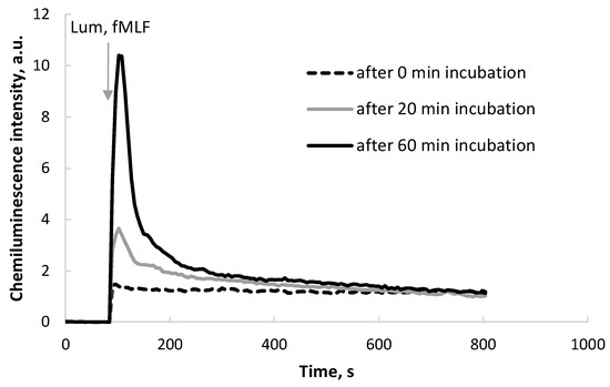 Figure 1 represents typical kinetic curves obtained by the induction of ROS generation by neutrophils. After respiratory burst stimulator fMLF and luminol were added to the cells, a CL increase was recorded, which was 100 to 1000 times higher than the background CL values of neutrophils.