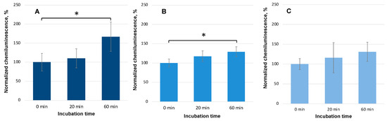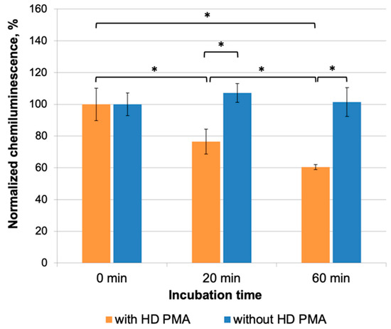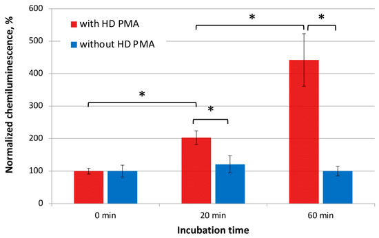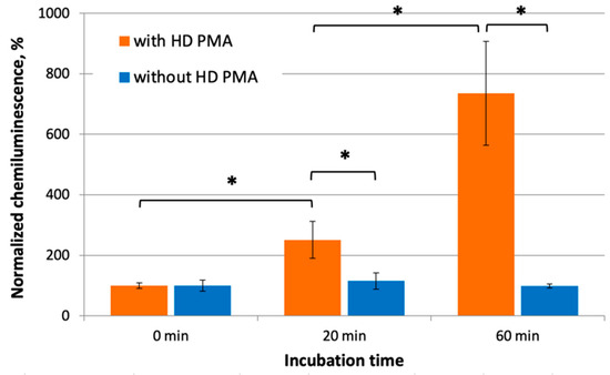 CL measurements of a series of similar experiments are presented in Figure 2. The incubation of 0.5% aqueous ethanol samples jointly with samples containing HD PMA (Figure 2, orange bars) for 20 and 60 min resulted in an increase in ROS production by neutrophils by an average of 2.5 and 7 times, respectively, compared to control measurements made before joint incubation. Data from control measurements before joint incubation were taken as 100%, and normalization was carried out relative to mean values for control samples. Normalized maximum CL values in the group of samples after 60 min of incubation differ significantly both from the group of samples after 0 min of incubation and from the samples that were incubated for only 20 min (p < 0.05). Bartlett’s test revealed that the data were not homogenous, so Welch’s t-test was used for statistical processing. This proved that normalized maximum CL values after 20 and 60 min of the joint incubation of the donor and acceptor were significantly higher compared to the “0 min” control (p < 0.05) and different from each other.