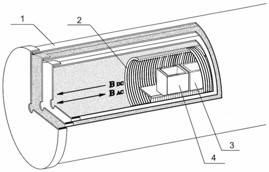 Controlled magnetic field-generating device. 1—Permalloy shields; 2—Solenoid (magnetic copper wire coil); 3—Cuvette with an acceptor sample (aqueous alcohol solution); 4—Cuvette with a donor sample (HD PMA); BAC—Magnetic induction produced by alternating current; BDC—Magnetic induction produced by direct current.