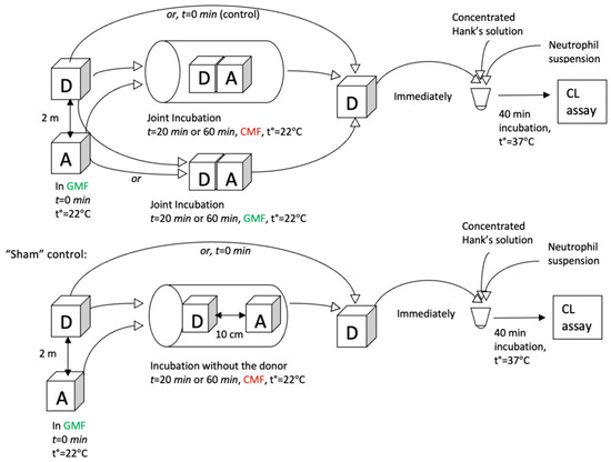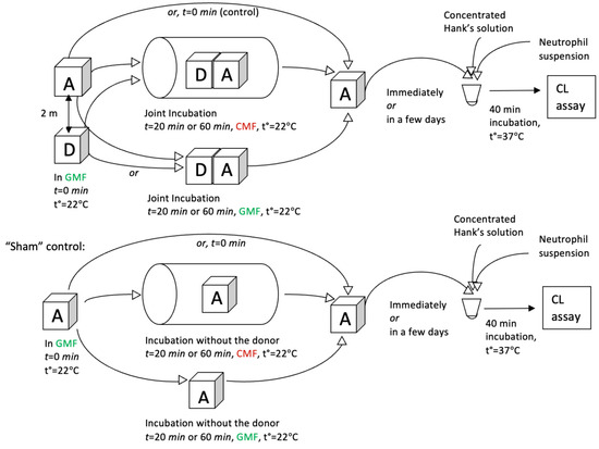 To assess the effect of the donor on the acceptor, a sample of HD PMA (donor) was incubated at room temperature (23–24 °C) in the presence of an acceptor sample (0.5% ethanol). The plan of the experiment is summarized in Figure 7. Eighteen ml of each sample (donor or acceptor) was placed in identical optical glass cuvettes (Hellma Analytics, Müllheim, Germany, cat. No. 704-001-30-10) with a cap, and jointly incubated in the CMF-generating device with the settings described below. The duration of joint incubation was 20 or 60 min. There were 2 types of controls. As a “sham” control, the acceptor was also incubated for 20 or 60 min in a CMF-generating device without the donor. As another control, a “0 min” incubation of the acceptor without the donor in GMF (outside the CMF-generating device) was used. When donors and acceptors were not jointly incubated, they were kept in the same room at a distance of 200 cm. Using each setting, 6 acceptor samples were prepared, and a 200 µL aliquot of each acceptor was taken for analysis using a cellular chemiluminescence assay (see “Neutrophil suspension preparation for chemiluminescence assay”).